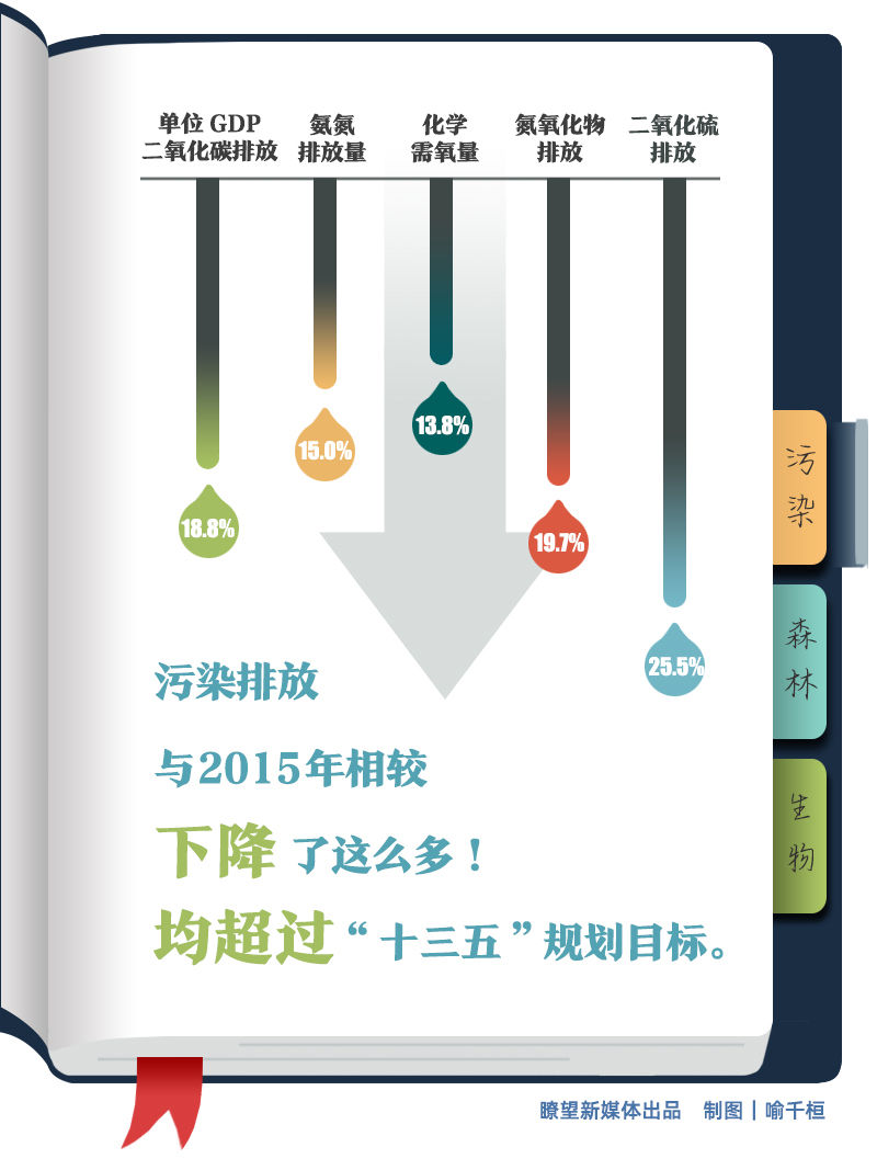 污染更少,減排更有效。二氧化硫、氮氧化物、化學需氧量、氨氮排放量較2015年分別下降25.5%、19.7%、13.8%、15.0%,單位GDP二氧化碳排放較2015年降低18.8%,均超過“十三五”規(guī)劃目標。