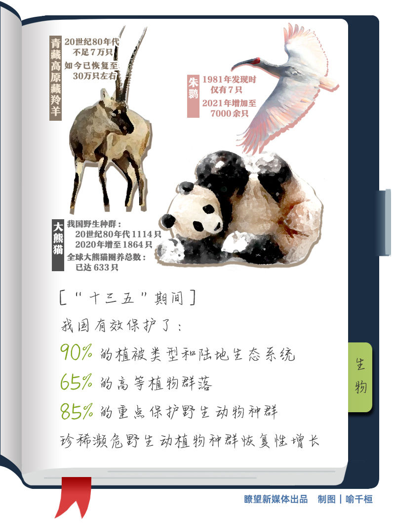 瀕危野生動植物保護不斷強化。“十三五”期間,我國有效保護了90%的植被類型和陸地生態(tài)系統(tǒng)、65%的高等植物群落,85%的重點保護野生動物種群,大熊貓、朱鹮、藏羚羊、蘇鐵等珍稀瀕危野生動植物種群實現(xiàn)恢復性增長。