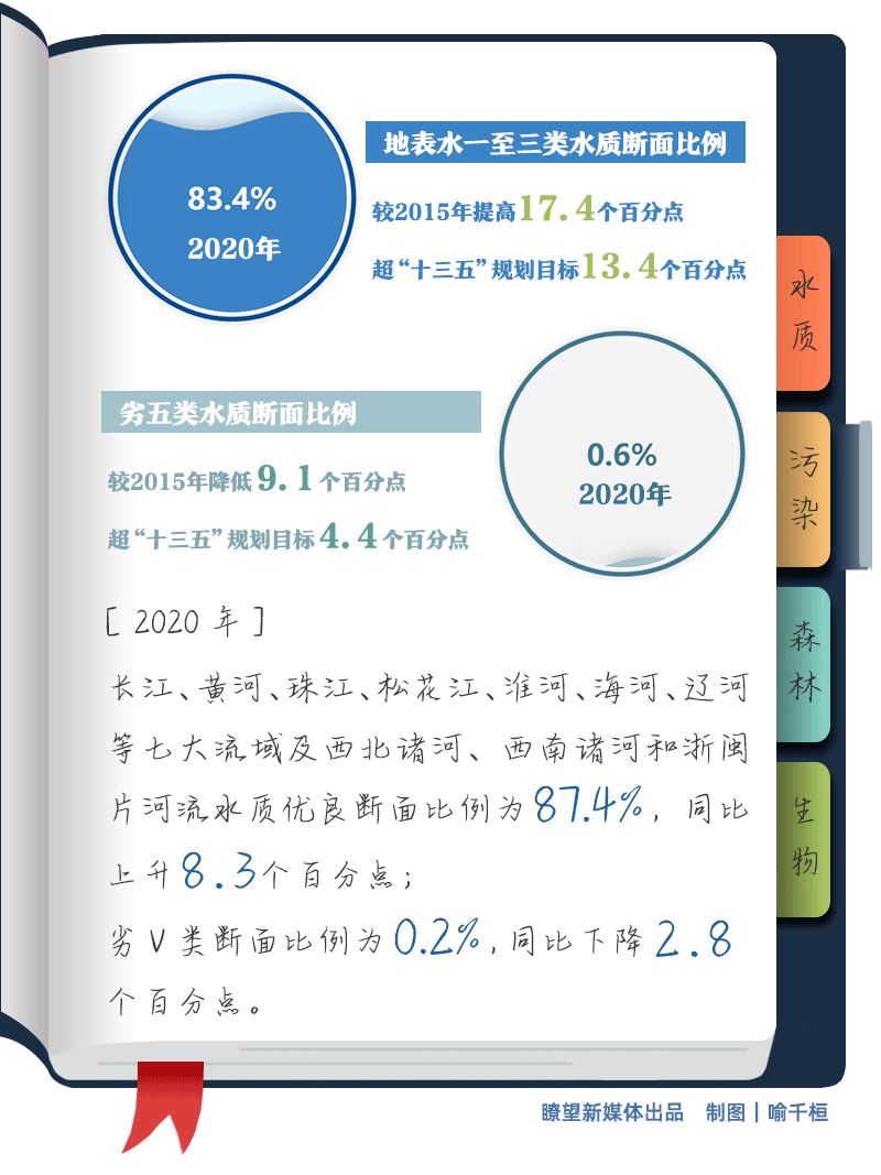 碧水更多,水質更優(yōu)良。地表水Ⅰ至Ⅲ類水質斷面比例由66%上升至83.4%,提高17.4個百分點,超過“十三五”規(guī)劃目標13.4個百分點;劣Ⅴ類水質斷面比例由9.7%下降到0.6%,降低9.1個百分點,超過“十三五”規(guī)劃目標4.4個百分點。