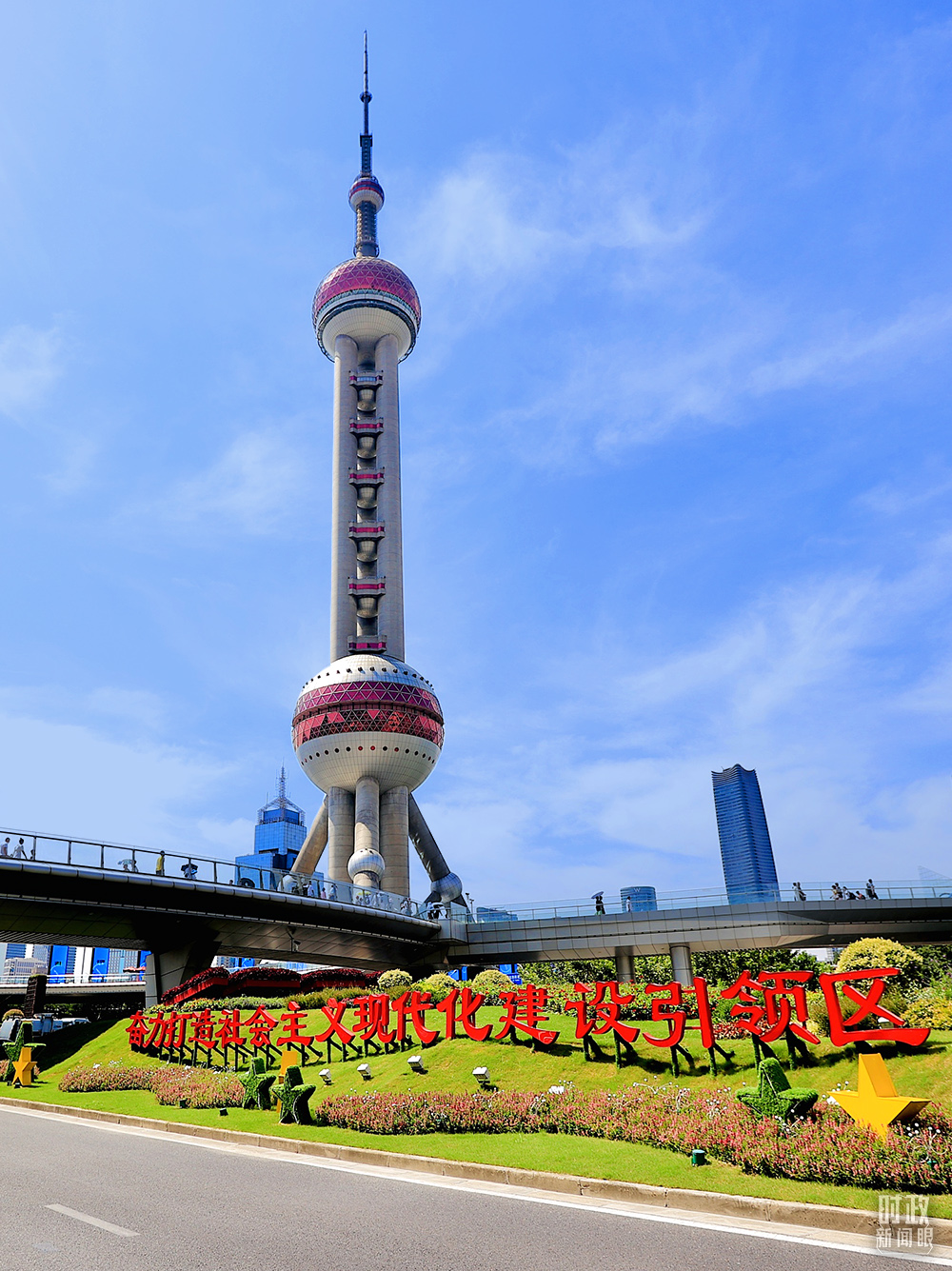 △2021年7月15日,“奮力打造社會(huì)主義現(xiàn)代化建設(shè)引領(lǐng)區(qū)”的標(biāo)語矗立在上海陸家嘴綠地中。(圖/視覺中國)