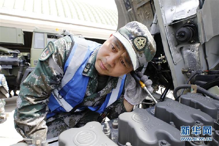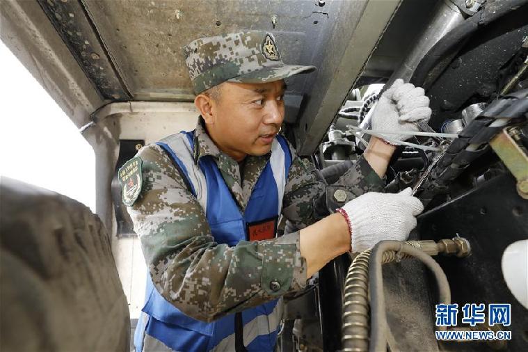 聯(lián)勤保障部隊(duì)某團(tuán)修理技師張俊凱在檢修車(chē)輛(2019年6月5日攝)。 新華社發(fā)(曾曾 攝)