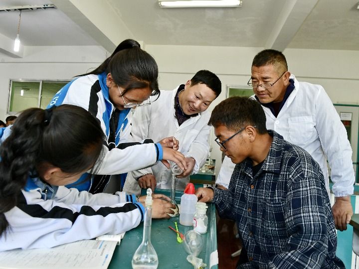 △西藏山南市第一高級(jí)中學(xué),學(xué)生們正在老師的指導(dǎo)下做化學(xué)實(shí)驗(yàn)。