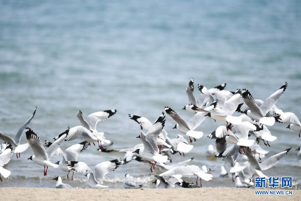 4月8日,一群棕頭鷗在青海湖岸邊飛翔。新華社記者 吳剛 攝