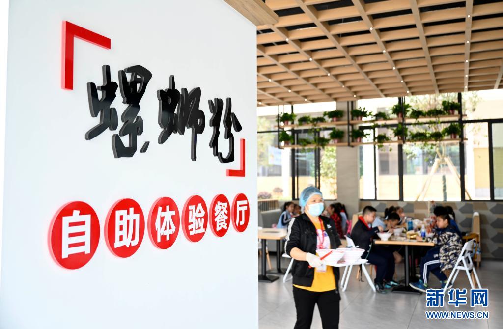 4月29日,在廣西柳州螺螄粉產(chǎn)業(yè)園,參加研學團的學生在一家螺螄粉企業(yè)里品嘗螺螄粉。新華社發(fā)(黎寒池 攝)