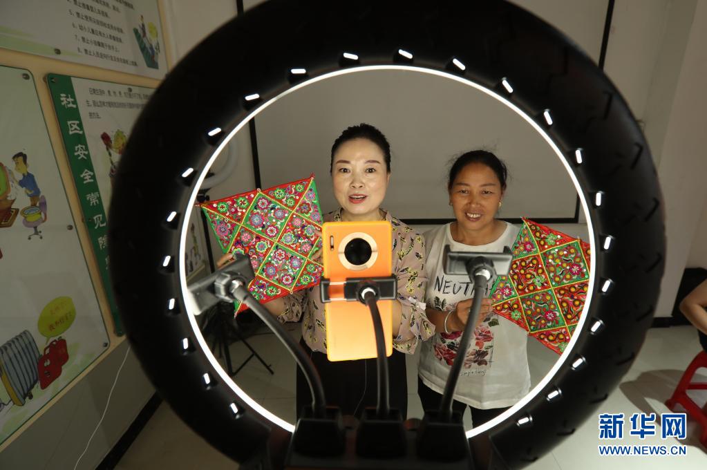 7月5日,在貴州省黔東南苗族侗族自治州榕江縣場壩社區(qū)服務中心網(wǎng)絡直播營銷技能培訓教室里,學員在直播營銷刺繡手工藝品。新華社發(fā)(李長華 攝)