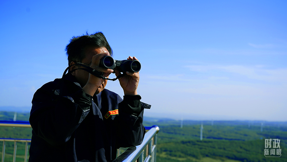 △防火瞭望員于成,自2001年起就在塞罕壩蔡木山值守,白天每隔15分鐘瞭望、記錄并報(bào)告一次。(總臺央廣記者潘毅拍攝)