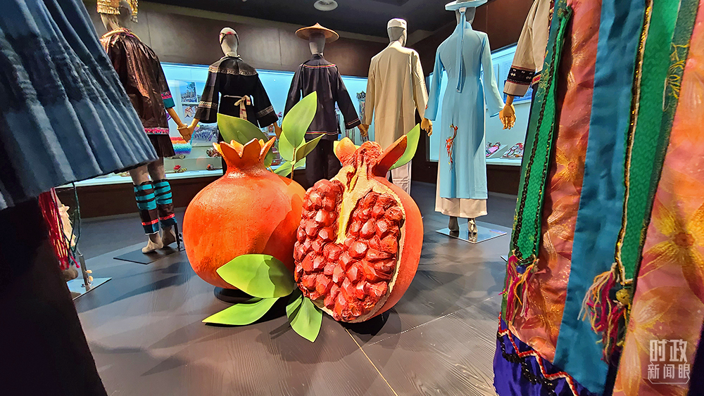 △習近平總書記曾經(jīng)形容,各民族就像石榴籽一樣緊緊抱在一起。這是廣西民族博物館中的主題雕塑。(總臺央視記者趙化拍攝)