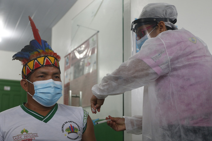醫(yī)護(hù)人員在巴西亞馬孫州塔巴廷加市為一名原住民接種中國(guó)新冠疫苗(1月19日攝)。新華社發(fā)(盧西奧·塔沃拉攝)