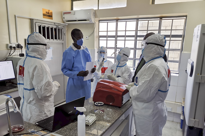 在南蘇丹首都朱巴的一處新冠病毒檢測(cè)機(jī)構(gòu),中國(guó)抗疫醫(yī)療專(zhuān)家組成員與南一線醫(yī)護(hù)人員交流(2020年8月21日攝)。新華社發(fā)(中國(guó)駐南蘇丹大使館供圖)