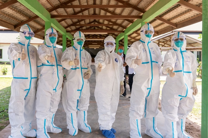 中國(guó)抗疫專(zhuān)家組在老撾北部烏多姆賽省準(zhǔn)備進(jìn)入新冠確診患者隔離病房(5月10日攝)。新華社發(fā)(農(nóng)麗春攝)