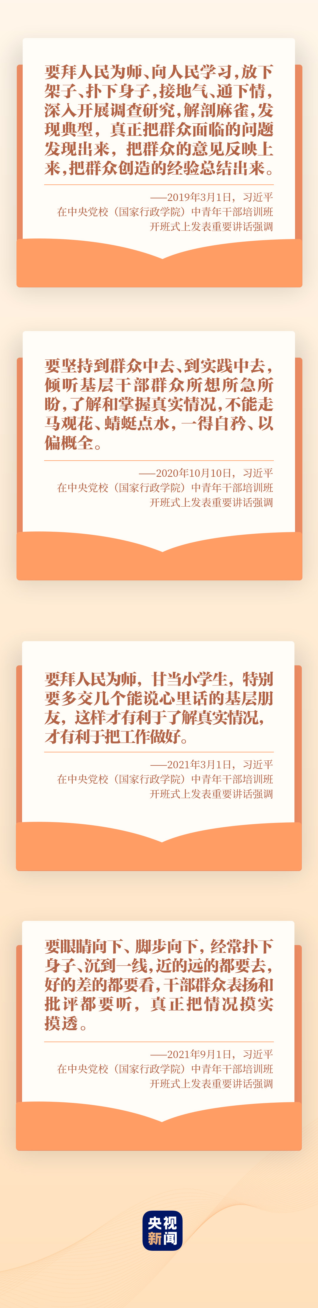 “堅(jiān)持從群眾中來、到群眾中去,真正成為群眾的貼心人” “既要‘身入’基層,更要‘心到’基層”“掌握調(diào)查研究這個基本功”……2019年以來,習(xí)近平總書記在中青年干部培訓(xùn)班開班式上多次要求干部拜人民為師,深入基層開展調(diào)查研究。