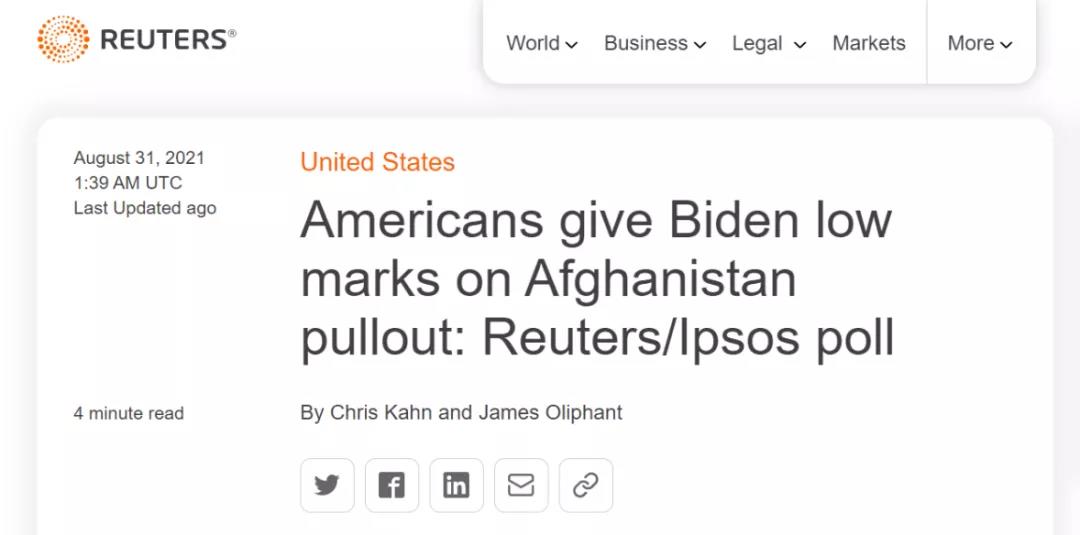 △路透社和益普索民調(diào):美國人在阿富汗撤軍上給了拜登低分