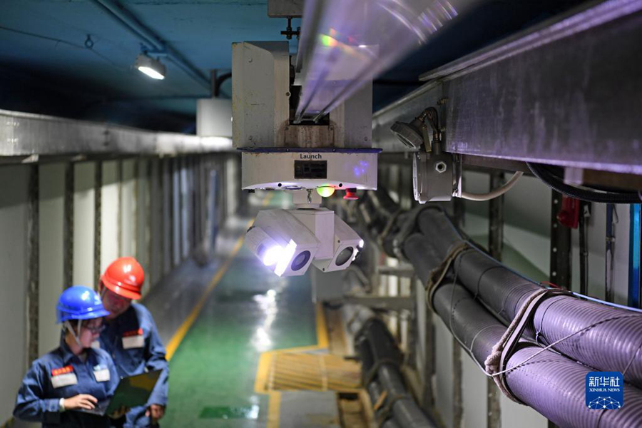 在珠海橫琴綜合管廊電力隧道里,南方電網(wǎng)工作人員操作巡檢機器人對電纜隧道動態(tài)巡檢(2019年12月12日攝)。新華社記者 梁旭 攝