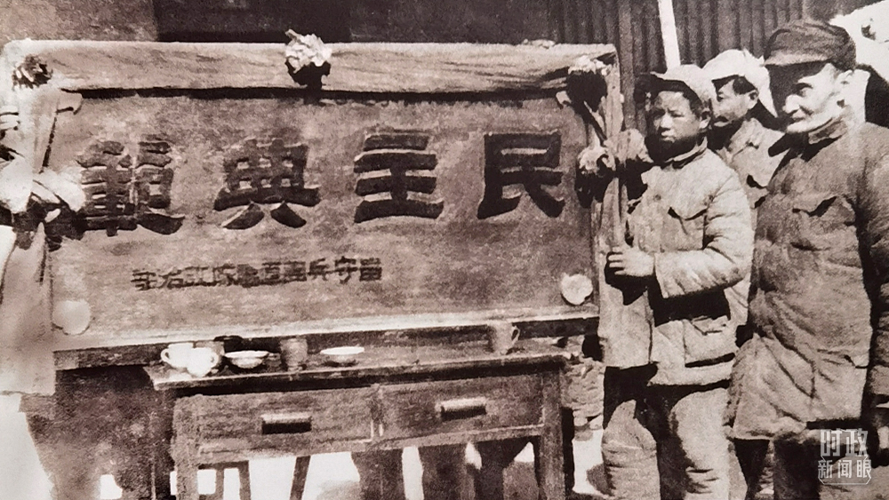 △陜甘寧邊區(qū)政府接受八路軍留守兵團贈送的“民主典范”牌匾。(總臺央視記者馬立飛提供)