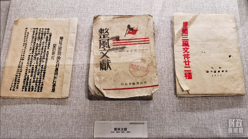 △中共綏德地委舊址專題展陳,從左至右分別是整風文獻的刻印版、原件和復(fù)制版。(總臺央視記者馬立飛拍攝)
