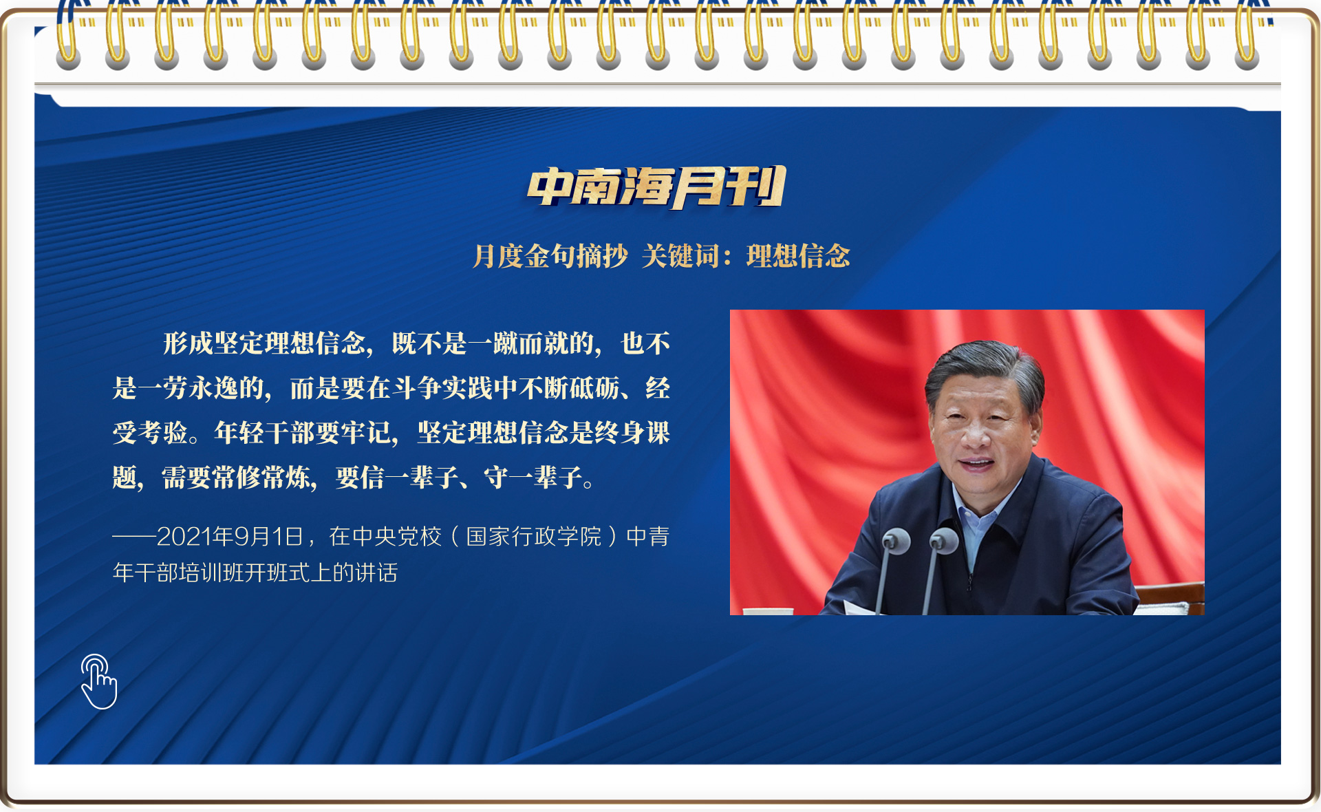 九月的第一天,總書記在2021年秋季學(xué)期中央黨校(國(guó)家行政學(xué)院)中青年干部培訓(xùn)班開班式上,為中青年干部講授重要一課。九月的最后一天,總書記在北京天安門廣場(chǎng)出席烈士紀(jì)念日向人民英雄敬獻(xiàn)花籃儀式,崇尚英雄、致敬英雄,以行動(dòng)為我們?cè)俅紊狭松鷦?dòng)一課。不忘本,才能開辟未來。