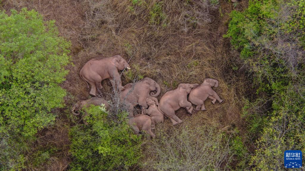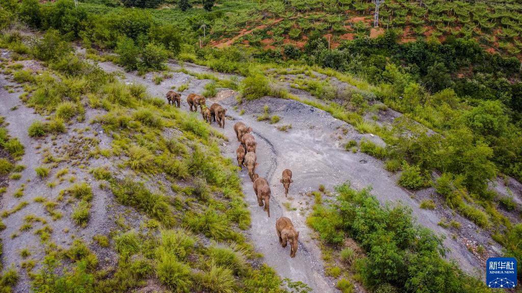 2021年6月7日在云南昆明市晉寧區(qū)夕陽彝族鄉(xiāng)拍攝的野象(無人機(jī)照片)。新華社發(fā)
