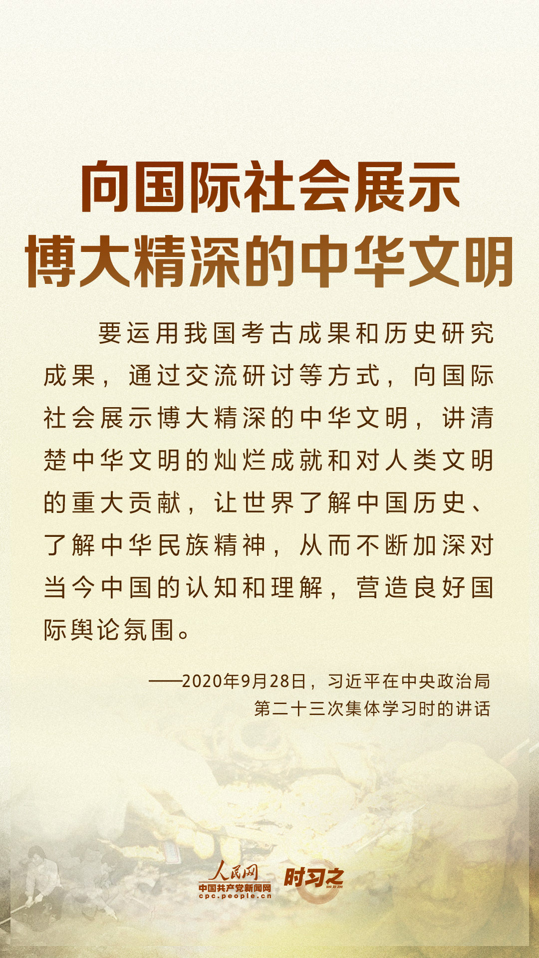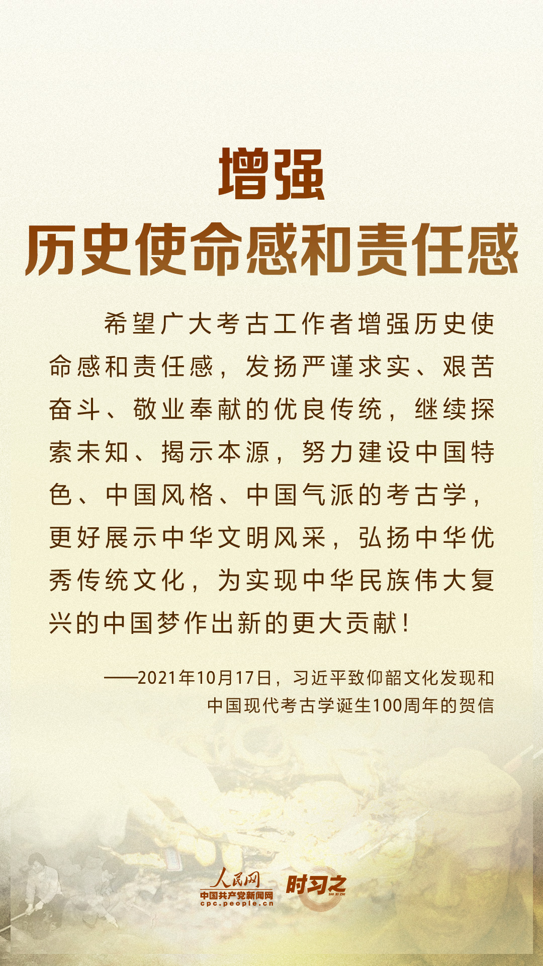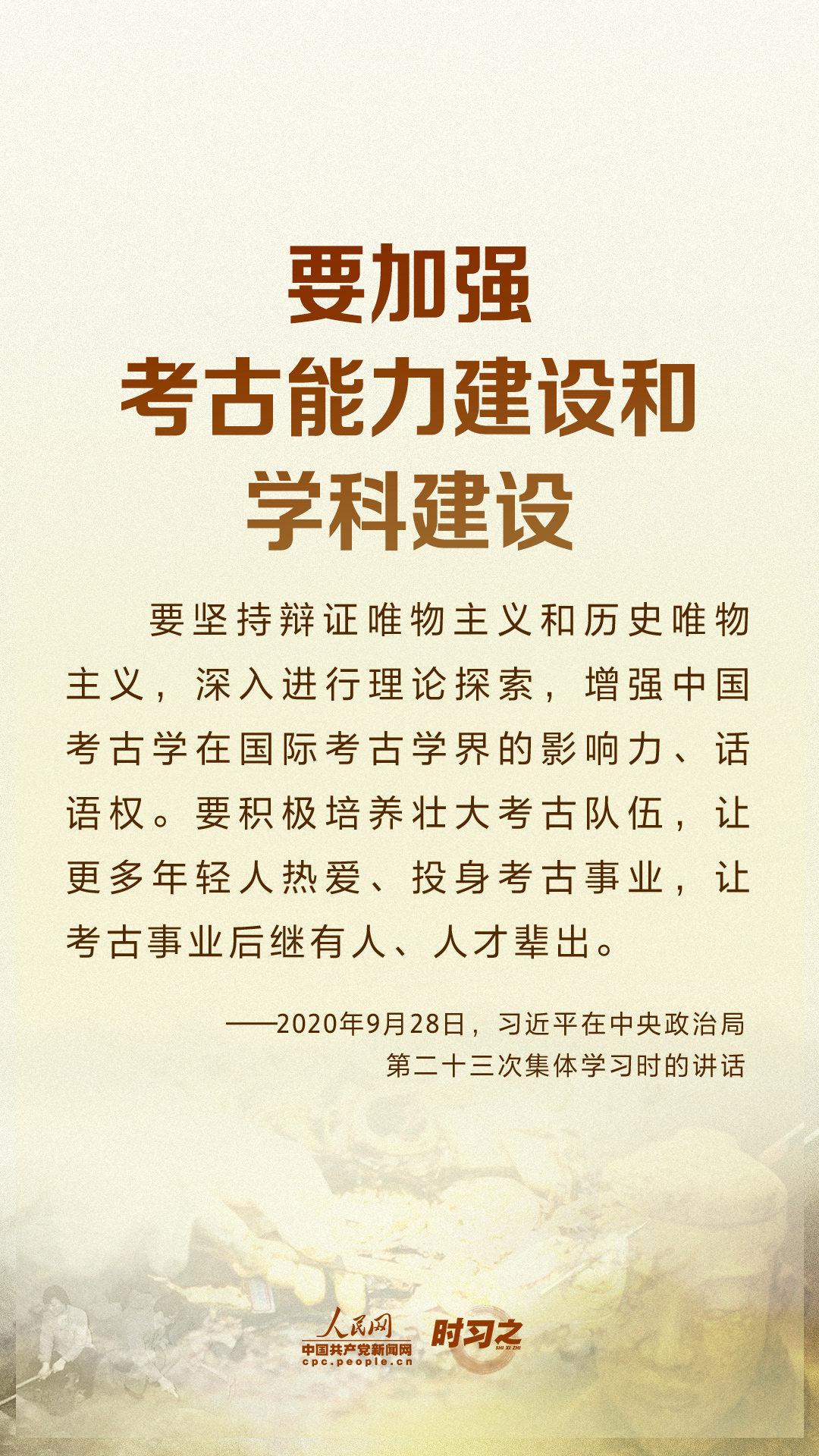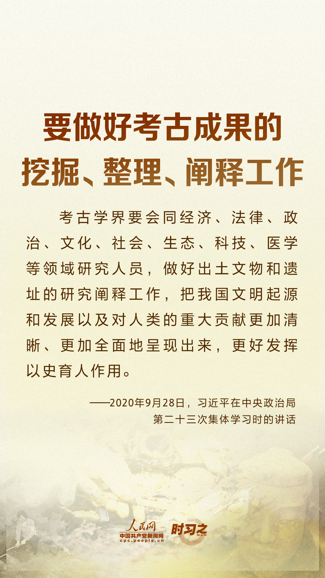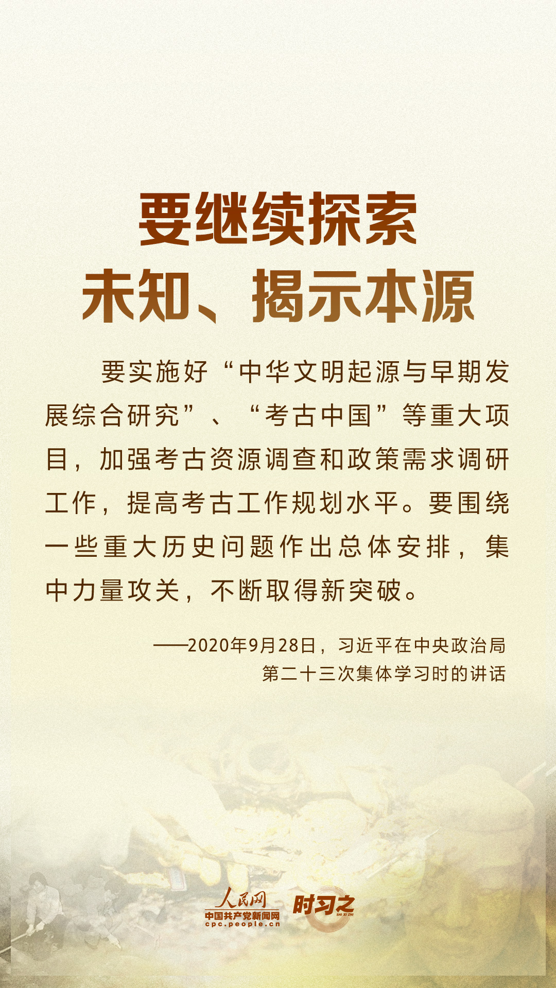 時習之習近平要求:努力建設中國特色、中國風格、中國氣派的考古學 10月17日,在仰韶文化發(fā)現和中國現代考古學誕生100周年之際,中共中央總書記、國家主席、中央軍委主席習近平發(fā)來賀信,代表黨中央向全國考古工作者致以熱烈的祝賀和誠摯的問候。