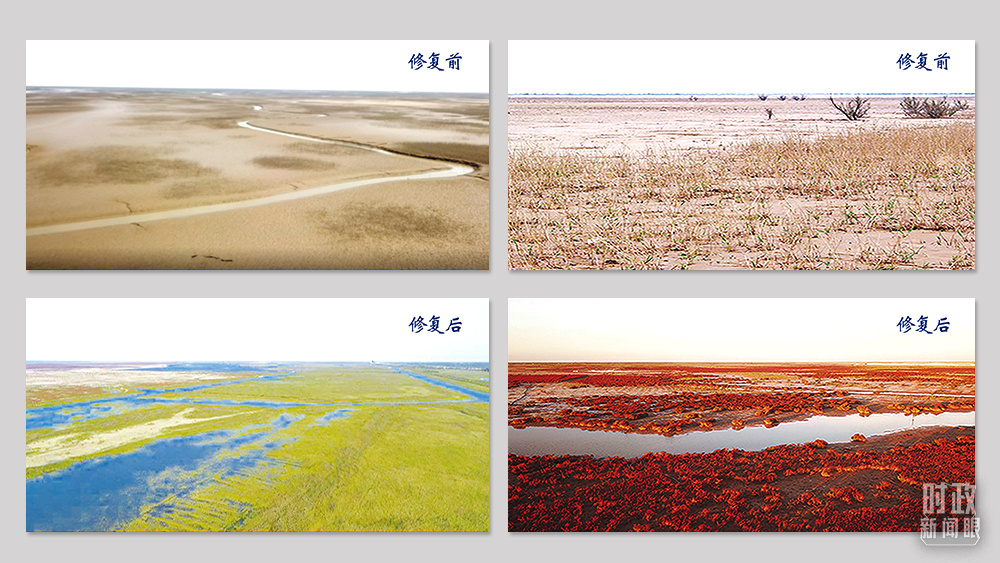 △黃河口河流沼澤濕地(左)和鹽沼濕地(右)生態(tài)修復(fù)對比圖。(總臺央視記者盧心雨提供)