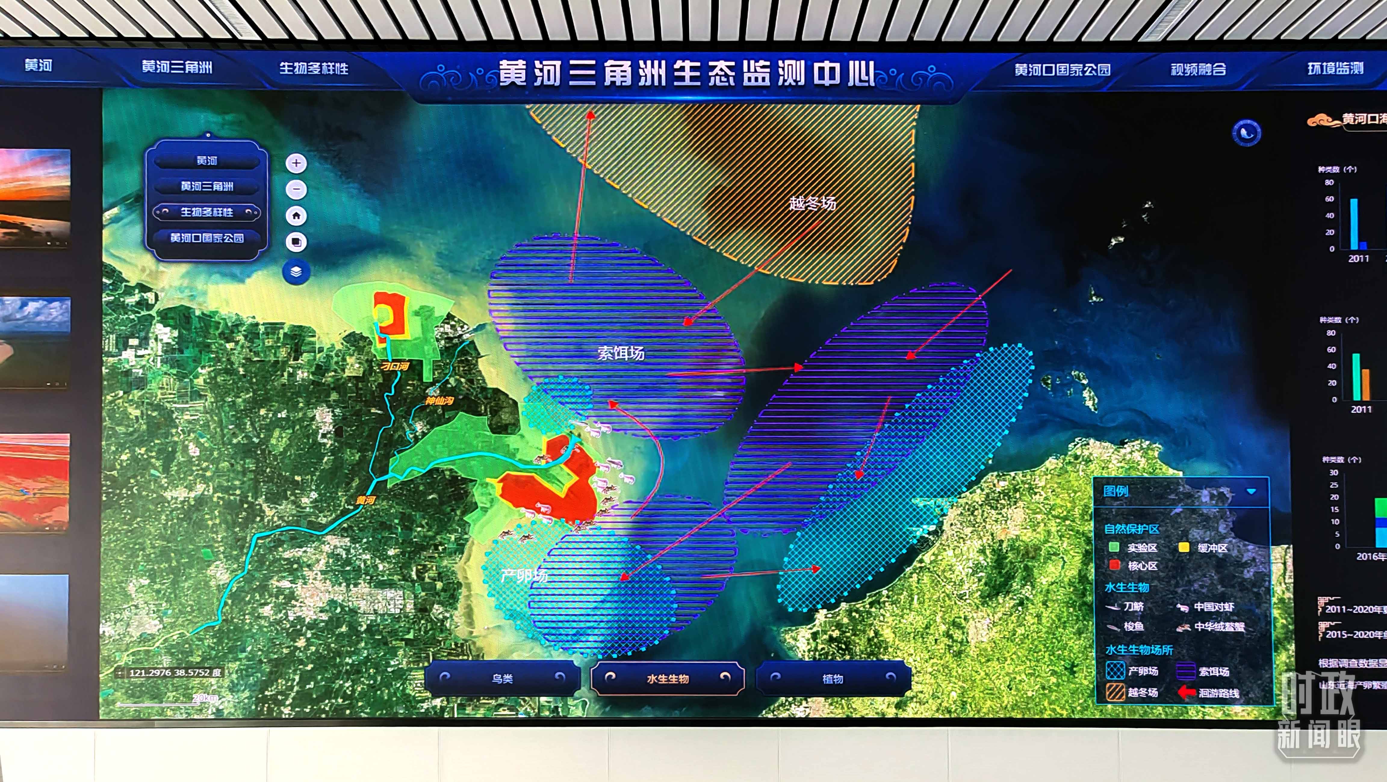 △監(jiān)測中心大屏幕正在顯示黃河三角洲水生生物場所,包括產(chǎn)卵場、索餌場、越冬場。(總臺央視記者彭漢明拍攝)