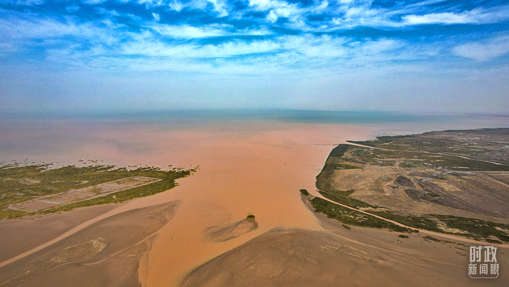 △俯瞰入???,雄渾的黃河與碧藍(lán)的大海相融。(總臺央視記者程鋮拍攝)