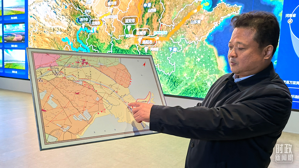 △黃河河口管理局局長裴明勝正在介紹黃河三角洲的防洪設(shè)施建設(shè)。(總臺央視記者韓銳拍攝)