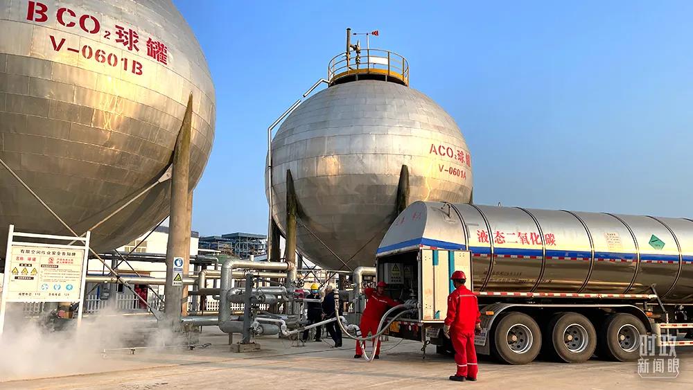 △油田工人將捕集后液化的二氧化碳裝車,運(yùn)往油田。(總臺(tái)央視記者謝曉光拍攝)