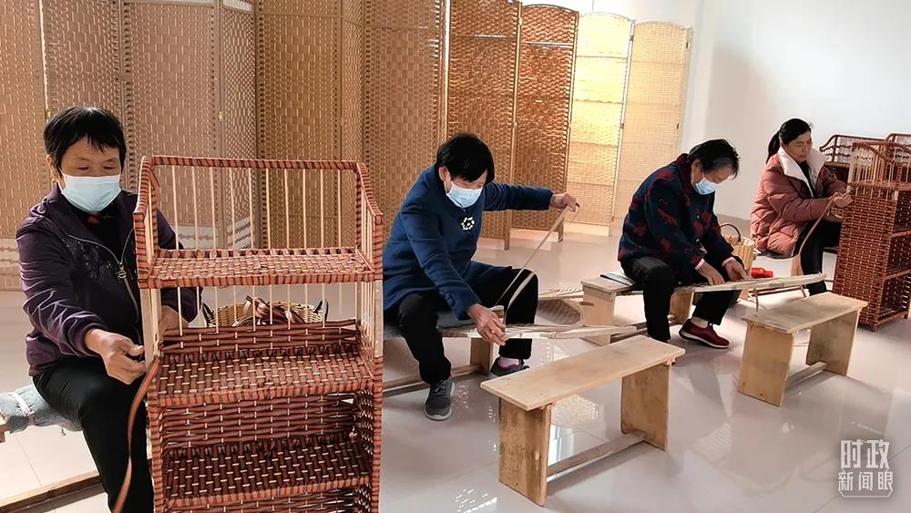 △楊廟社區(qū)成立草編合作社,老年人通過手工編織屏風(fēng)、鞋架等實(shí)現(xiàn)在家門口就業(yè)。(總臺(tái)央視記者楊松濤拍攝)