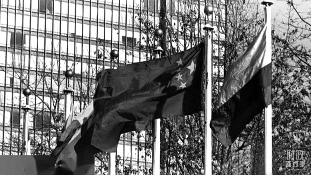 △新中國恢復(fù)聯(lián)合國合法席位后,五星紅旗飄揚(yáng)在聯(lián)合國大廈前的廣場(chǎng)上。(資料圖)