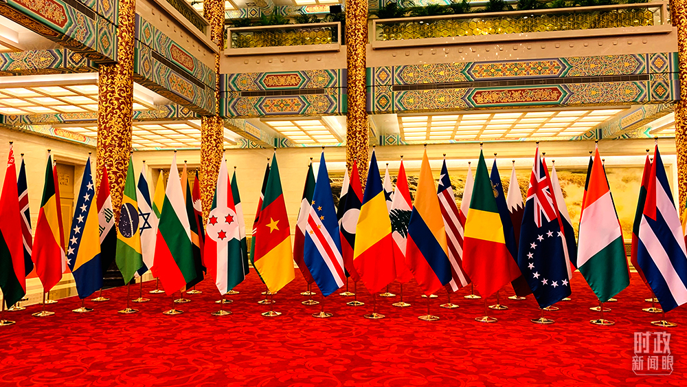 △紀(jì)念會(huì)議現(xiàn)場(chǎng),聯(lián)合國各會(huì)員國國旗組成的旗陣。(總臺(tái)央視記者范一鳴拍攝)