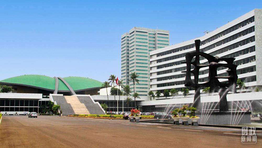 △印度尼西亞國(guó)會(huì)外景。2013年10月,習(xí)主席在這里發(fā)表演講首次提出建設(shè)21世紀(jì)“海上絲綢之路”。(總臺(tái)國(guó)廣記者蔡靖骉拍攝)