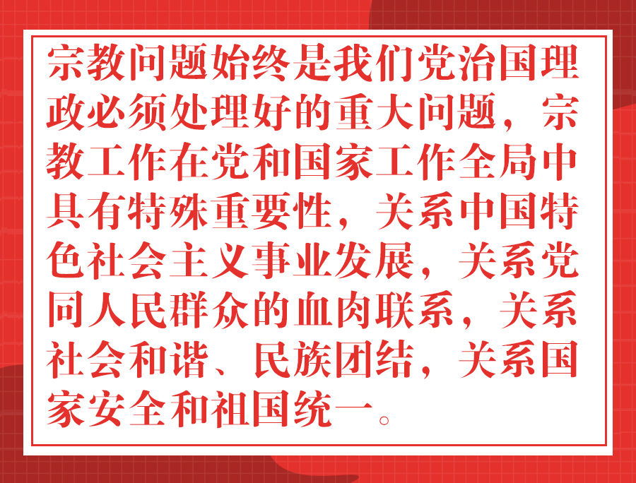 12月3日至4日,全國宗教工作會(huì)議在北京召開。中共中央總書記、國家主席、中央軍委主席習(xí)近平出席會(huì)議并發(fā)表重要講話。李克強(qiáng)、栗戰(zhàn)書、汪洋、王滬寧、趙樂際、韓正出席會(huì)議。