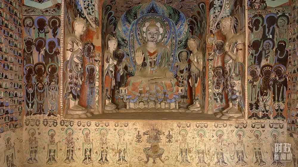 △敦煌莫高窟第420窟,創(chuàng)建于隋,南、西、北壁各開一龕,被稱為“三龕窟”。敦煌文化被認為集建筑藝術、彩塑藝術、壁畫藝術、佛教文化于一身。(資料圖)