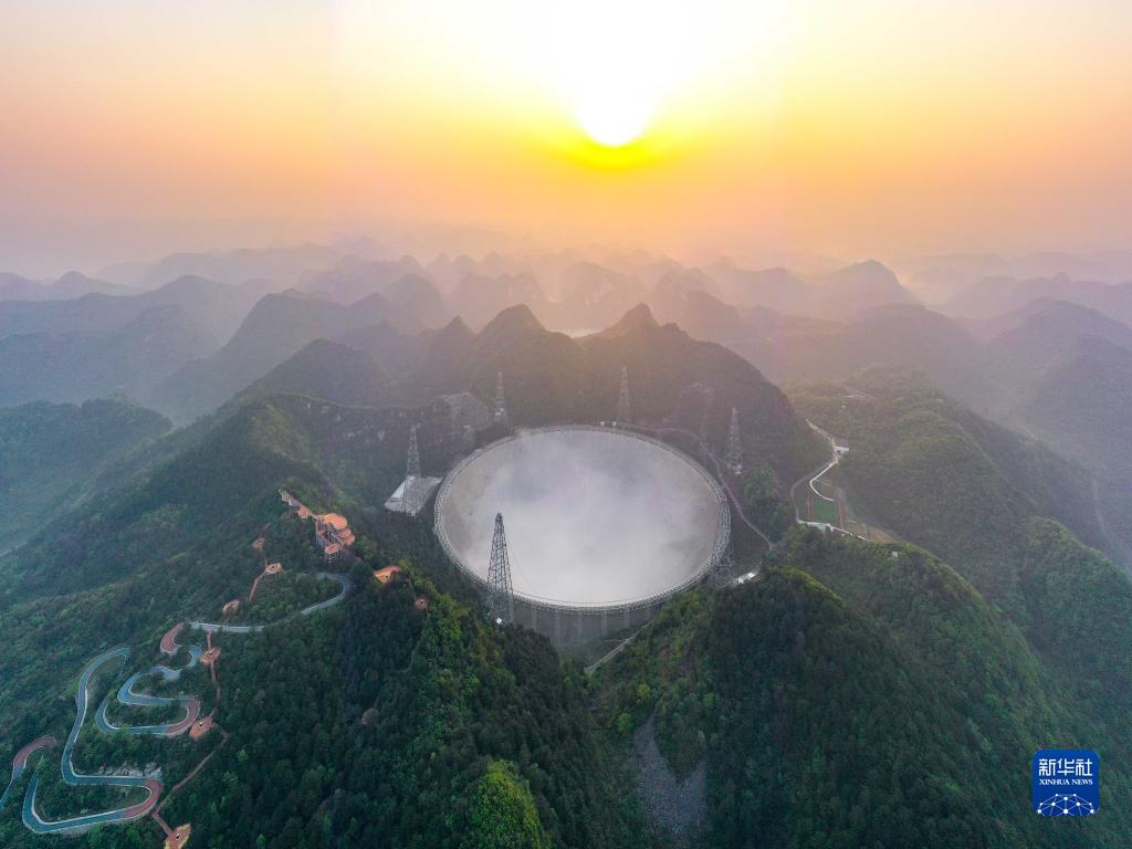 3月31日清晨拍攝的“中國天眼”全景(維護保養(yǎng)期間拍攝,無人機照片)。新華社記者 歐東衢 攝