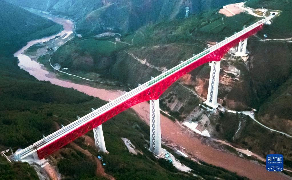 中老鐵路首發(fā)列車駛過中國云南省元江哈尼族彝族傣族自治縣境內(nèi)的元江雙線特大橋(12月3日攝,無人機照片)。新華社記者 王冠森 攝