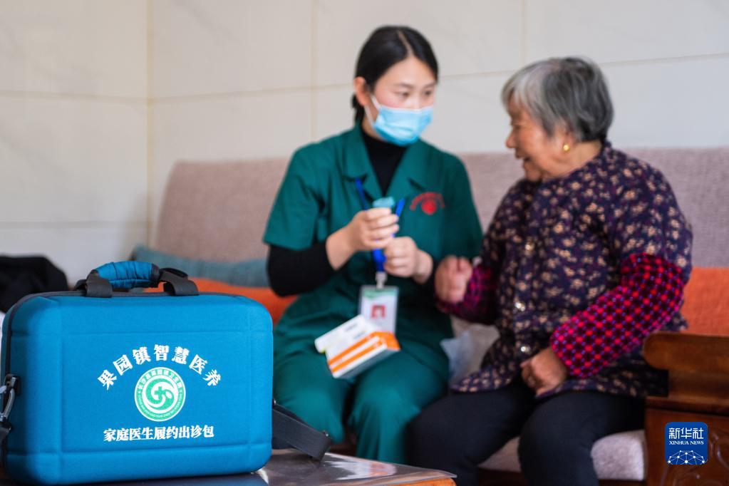 11月12日,在湖南省長沙市長沙縣果園鎮(zhèn)楊泗廟社區(qū),醫(yī)務人員劉敏指導居家老人用藥。新華社記者 陳思汗 攝