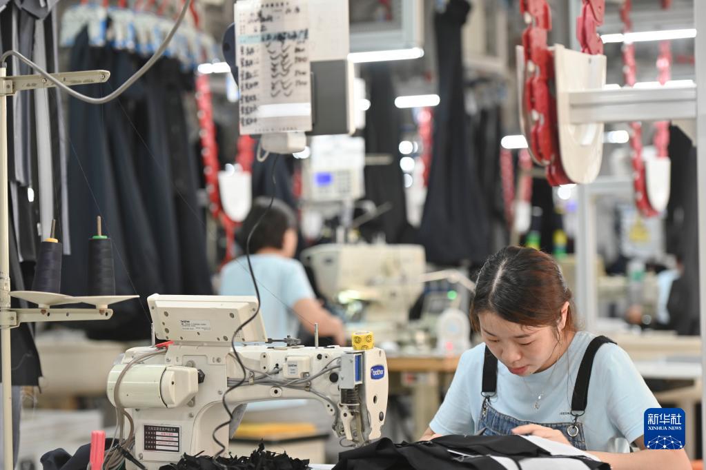 在位于福建省泉州市經(jīng)濟技術開發(fā)區(qū)的九牧王西褲智能化生產(chǎn)車間,工人在自動化西褲吊掛流水線上作業(yè)(7月30日攝)。新華社記者 宋為偉 攝