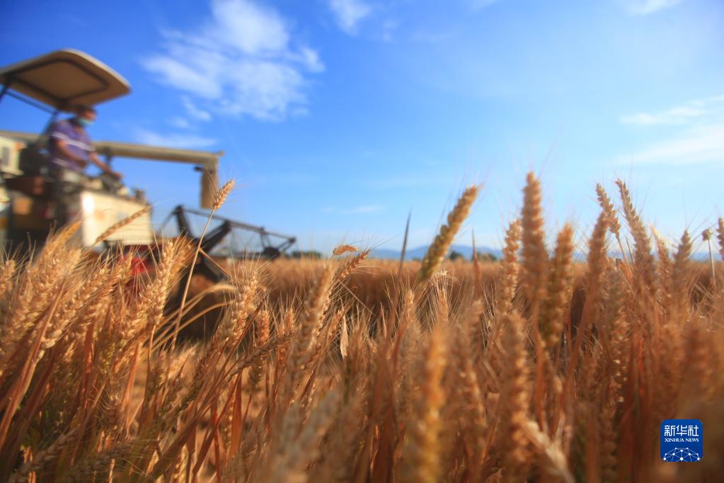 收割機(jī)在山東省臨沂市平邑縣的麥田里收割小麥(6月8日攝)。新華社發(fā)(武紀(jì)全 攝)