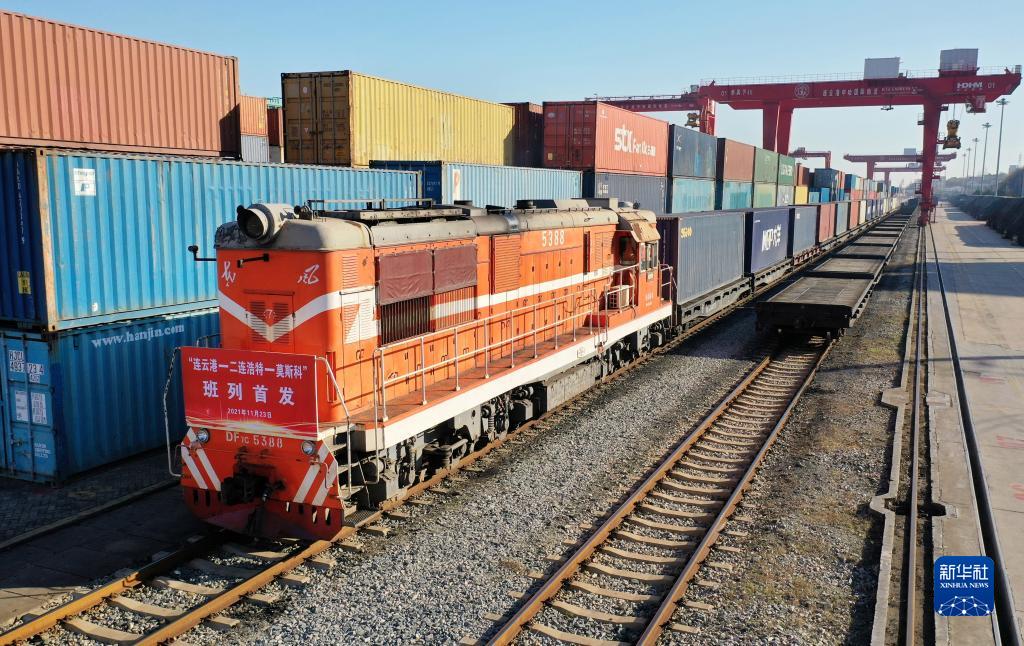 “連云港—二連浩特—莫斯科”中歐班列在江蘇連云港中哈物流基地整裝待發(fā)(11月23日攝,無人機(jī)照片)。新華社發(fā)(王健民 攝)