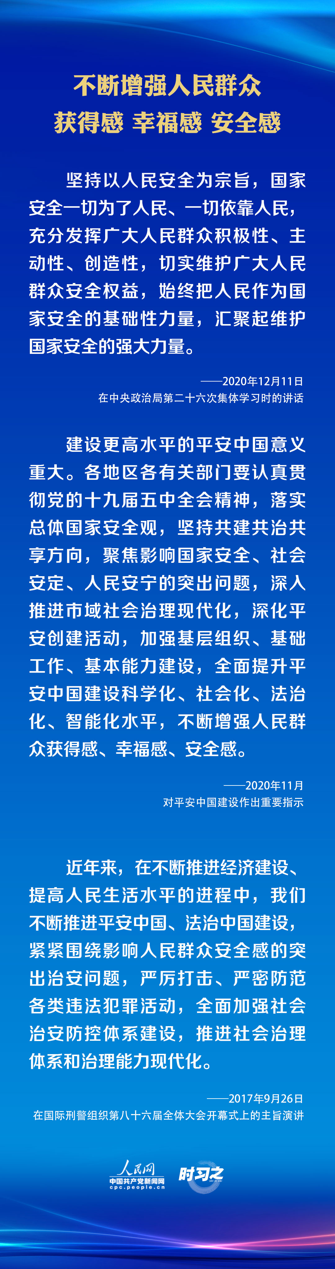 平安,民生所盼、發(fā)展之基。平安中國建設(shè),關(guān)系人民群眾的獲得感、幸福感、安全感。黨的十八大以來,習(xí)近平總書記高度重視平安中國建設(shè),多次作出重要指示,闡明了具有全局性、戰(zhàn)略性、基礎(chǔ)性的重大理論和實(shí)踐問題,為建設(shè)更高水平的平安中國領(lǐng)航掌舵。