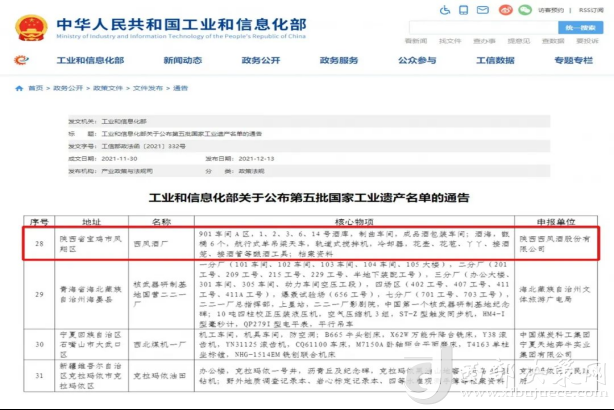 西部決策網訊(韓宗憲)12月13日,工業(yè)和信息化部公布了第五批國家工業(yè)遺產名單,西鳳酒釀酒工業(yè)遺產群作為唯一的中國白酒生產釀造項目同全國其他30家工業(yè)遺產一起進入名單。這也是繼6月10日國家級非物質文化遺產榜單發(fā)布以來,西鳳榮列的又一重磅國家級名單。既標志了相關部門和廣大消費者對三千年無斷代西鳳酒釀造設備和釀造技藝的肯定,也表示出西鳳酒為中國白酒發(fā)展作出的突出貢獻。