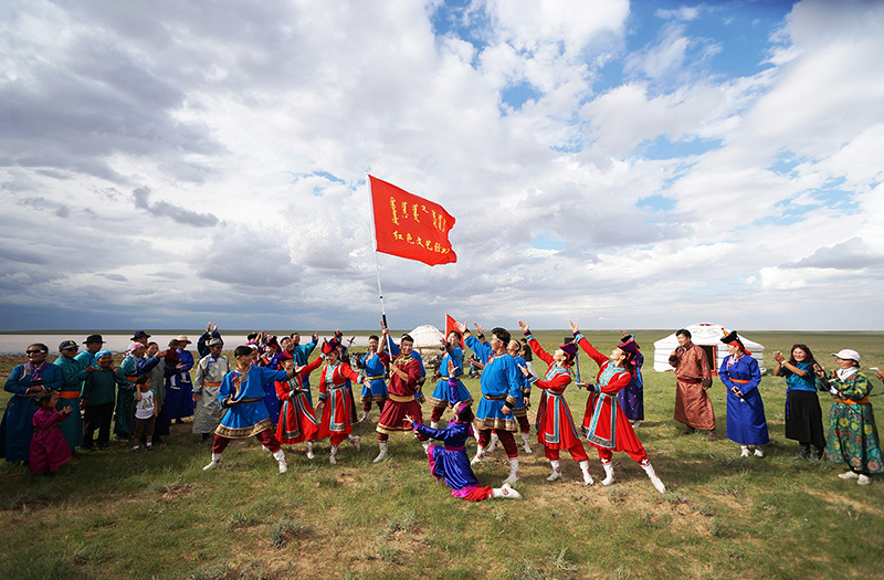 2018年8月22日,內(nèi)蒙古蘇尼特右旗烏蘭牧騎隊員在牧區(qū)演出。