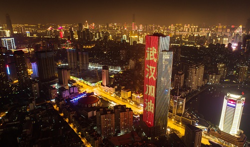 2020年1月31日,武漢市江漢區(qū)西北湖附近高層建筑外墻打出“武漢加油”等字樣。 新華社記者 肖藝九 攝
