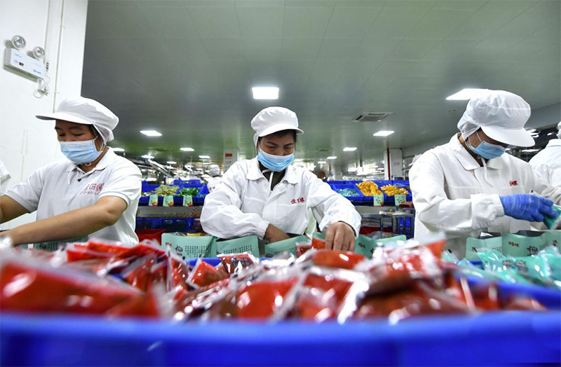 在廣西一食品有限公司螺螄粉生產(chǎn)車間,工人在生產(chǎn)線上包裝螺螄粉。