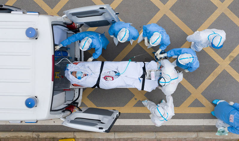 2020年3月6日,在湖北省武漢市的華中科技大學(xué)附屬同濟(jì)醫(yī)院中法新城院區(qū),醫(yī)護(hù)人員用負(fù)壓救護(hù)車轉(zhuǎn)運(yùn)一位新冠肺炎患者做CT檢查(無人機(jī)照片)。