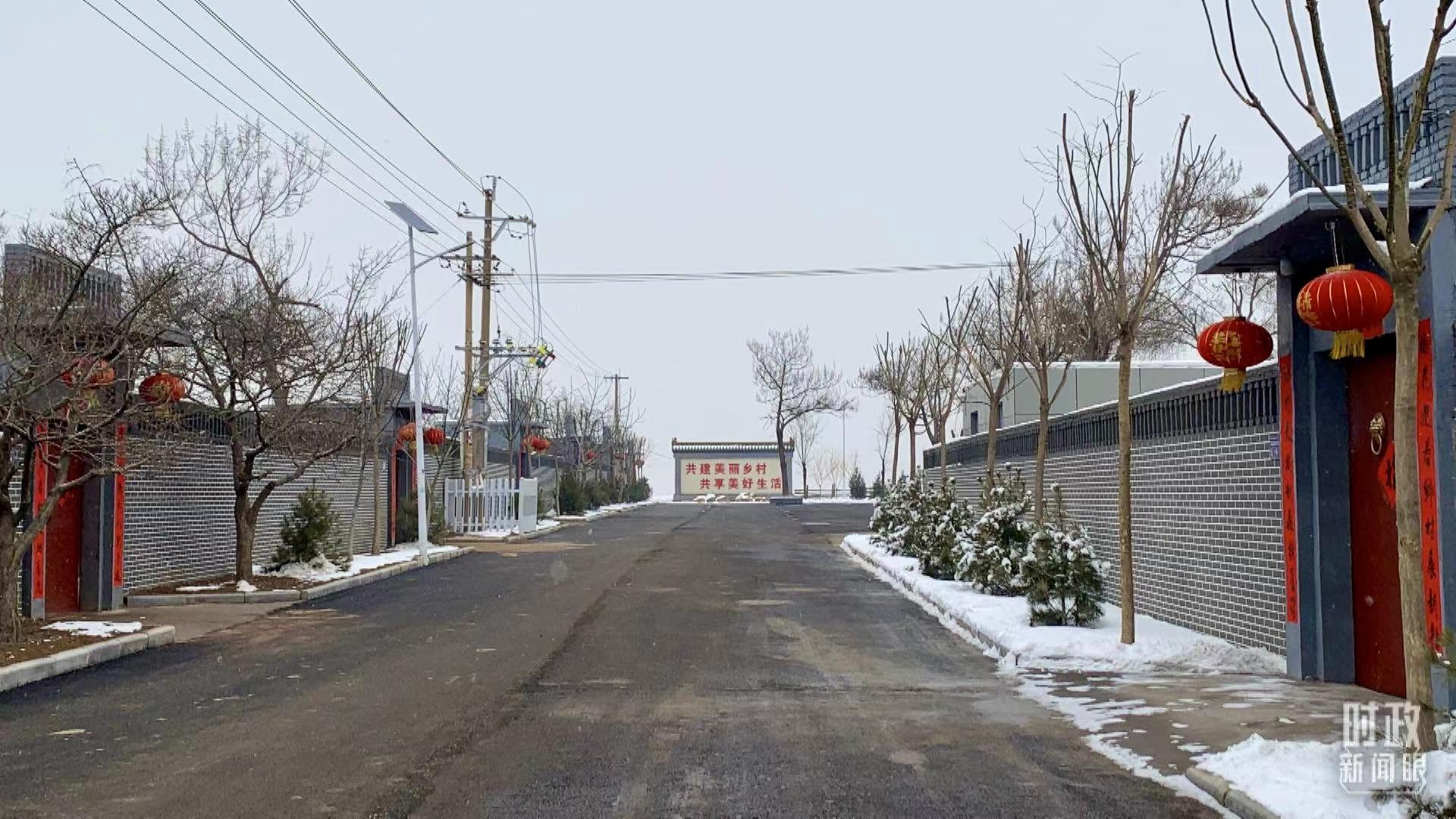 △馮南垣村修繕一新的大路,遠(yuǎn)處的標(biāo)語(yǔ)寫著“共建美麗鄉(xiāng)村 共享美好生活”。(總臺(tái)央視記者馬超拍攝)