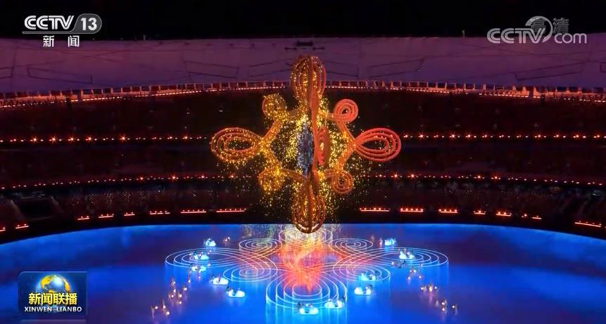 21時35分,2008年北京奧運會主題歌《我和你》的動人歌聲再次響起,閃閃發(fā)光的奧運五環(huán)從場地中央升起。主火炬“大雪花”緩緩落下,在純潔空靈的《雪花》歌聲中,燃燒了16天的奧運之火漸漸熄滅。