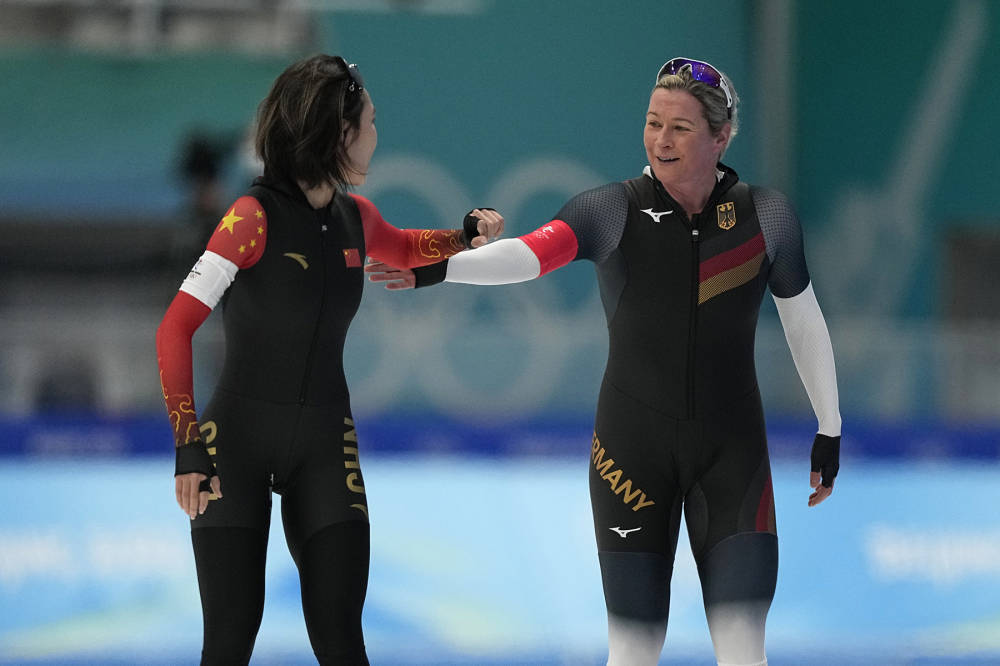 △比賽結(jié)束后,中國選手阿合娜爾向德國老將佩希施泰因表達敬意,佩希施泰因微笑著鼓勵阿合娜爾。