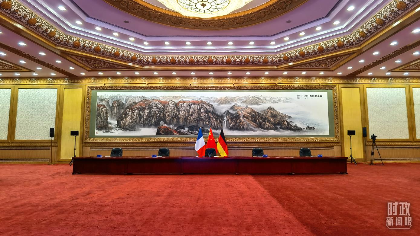 △視頻峰會現(xiàn)場擺放的中法德三國國旗。(總臺央視記者范一鳴拍攝)