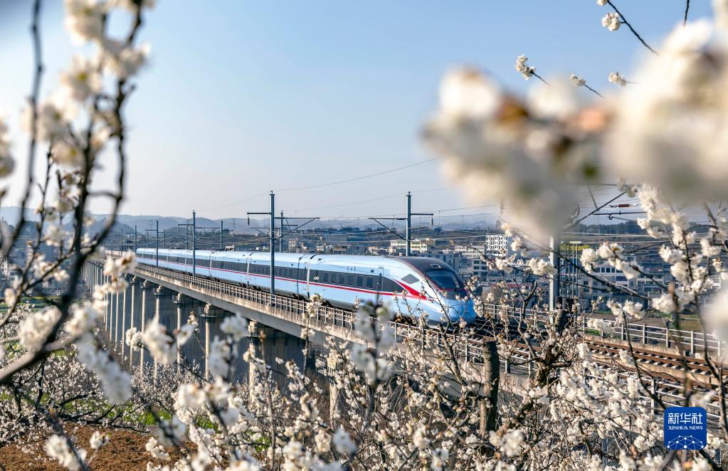 動車組列車在成貴高鐵貴州黔西段行駛(2022年3月7日攝)。 新華社發(fā)(范暉 攝)